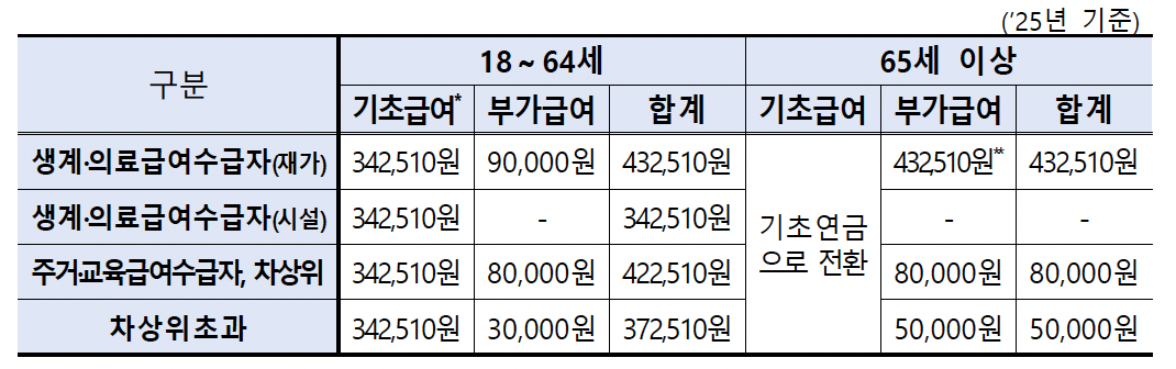 | 생계,의료급여수급자 (재가) | 342,510원 | 90,000원 | 432,510원 |